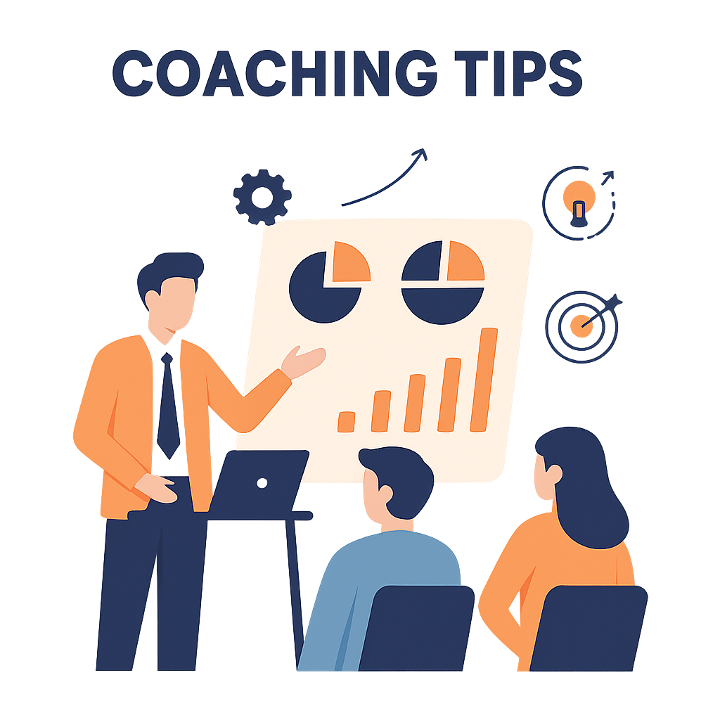 Business coaching — a mentor guiding a team with charts and strategy icons.